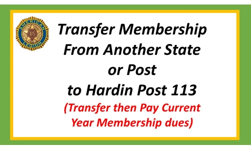You are granting permission for Hardin Post 113 to transfer your membership to Hardin Post 113 from your current Post. After transefer you are paying dues for current year.